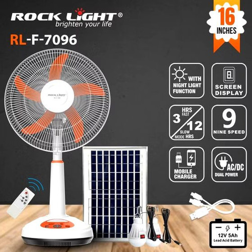 پنکه شارژی ایستاده روکی لایت مدل RL-F-7096 با قابلیت شارژ خورشیدی و پنل خورشیدی دار